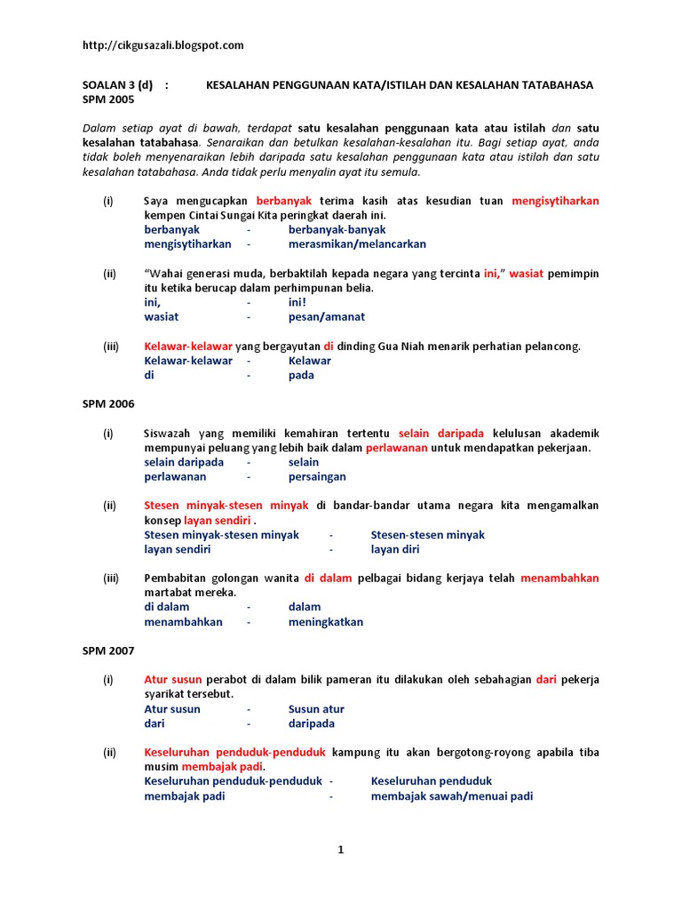 Nota kesalahan istilah dan tatabahasa spm. Kesalahan kata atau istilah dan satu kesalahan tatabahasa. Kesalahan istilah bermaksud kesalahan penggunaan kata iaitu penggunaan perkataan yang tidak sesuai dengan kehendak ayat atau situasi. Terdapat satu kesalahan ejaan dan satu kesalahan dari segi imbuhan. Bagi setiap ayat anda tidak boleh menyenaraikan lebih daripada satu kesalahan penggunaan kata dan istilah dan satu kesalahan tatabahasa.