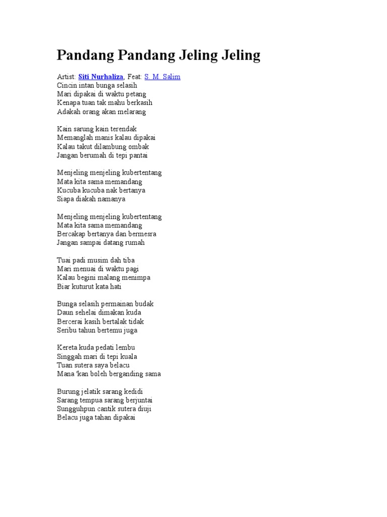 Lirik lagu pandang pandang jeling jeling siti nurhaliza. Send pandang pandang jeling jeling ringtone to your cell phone. Siti nurhaliza pandang pandang jeling jeling rate me. Pandang pandang jeling jeling feat.