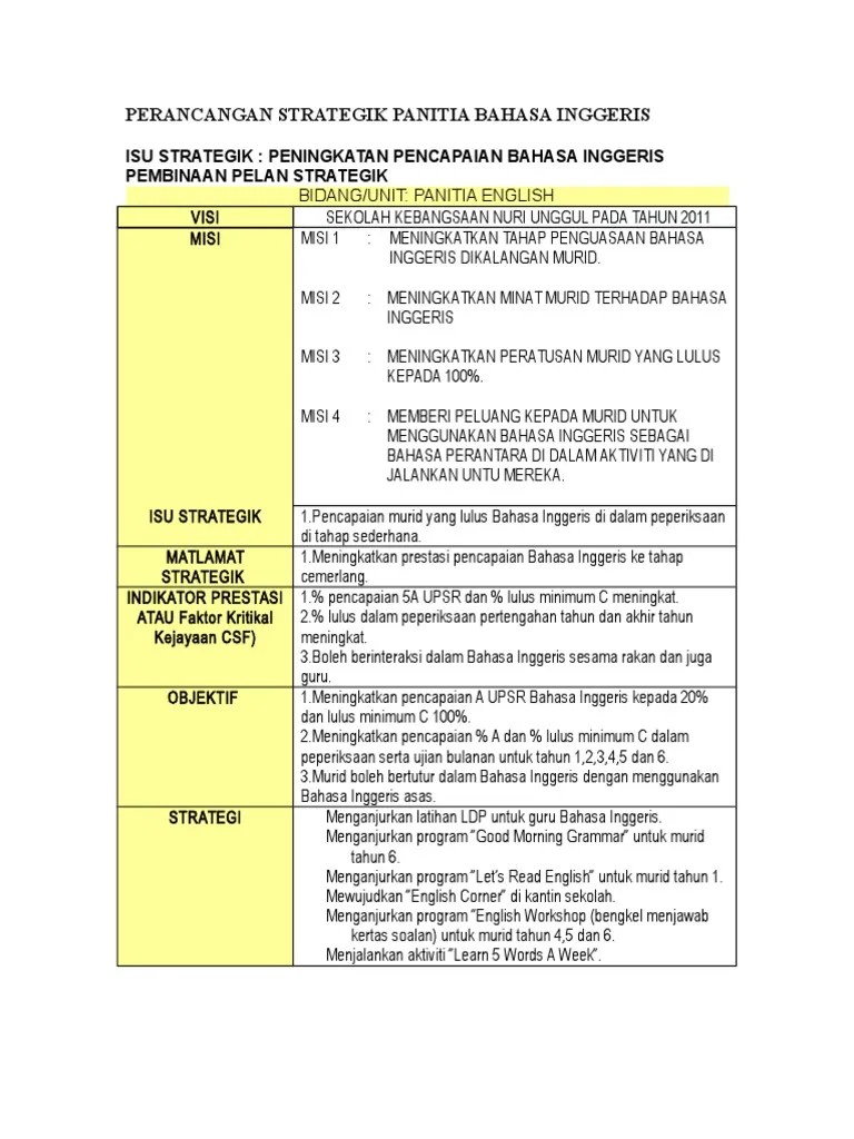 Jumlah perancangan strategik panitia bahasa inggeris sjk tamil jalan tajul skk tahun 2019. Memupuk semangat persaingan dalam kalangan murid untuk mendapat keputusan yang baik dalam peperiksaan. Gpk 1 dan ketua panitia 2 2 09 31 8 09 rm 400 semua guru bahasa inggeris dapat mengikuti program ldp yang telah dirancang untuk memantapkan p p a dan lulus minimum c dalam peperiksaan serta. Ppi bahasa inggeris siri 1 2020 3.