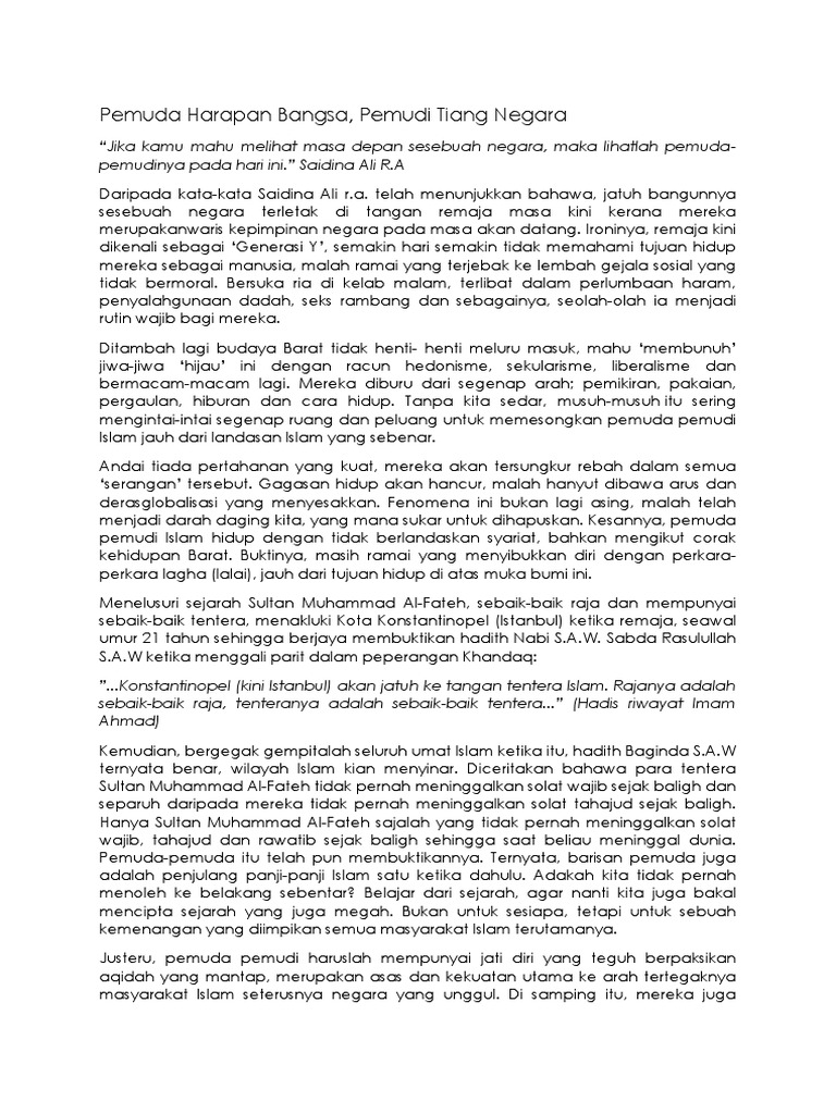 Pemuda harapan bangsa pemudi tiang negara maksud. Tokoh pendidik dan motivasi terulung negara aminudin baki pernah menyatakan ayam dikepuk mati kelaparan itik di air mati kehausan. Pemuda harapan bangsa pemudi tiang negara berdasarkan pernyataan di atas huraikan persediaan persediaan yang perlu dilakukan oleh remaja untuk merealisasikan cabaran tersebut. Agaknya mungkin hari ini tiada pengharapan seumpama itu disebut sebut lagi maka anak anak belia kita leka dan hidup dalam dunia khayalan mengejar keseronokan dan kemewahan yang sementara. Pemuda harapan bangsa pemudi tiang negara agak lama kita tidak mendengar moto yang dulunya sering dilaung laungkan oleh pemimpin dan juga diiklankan di tv.