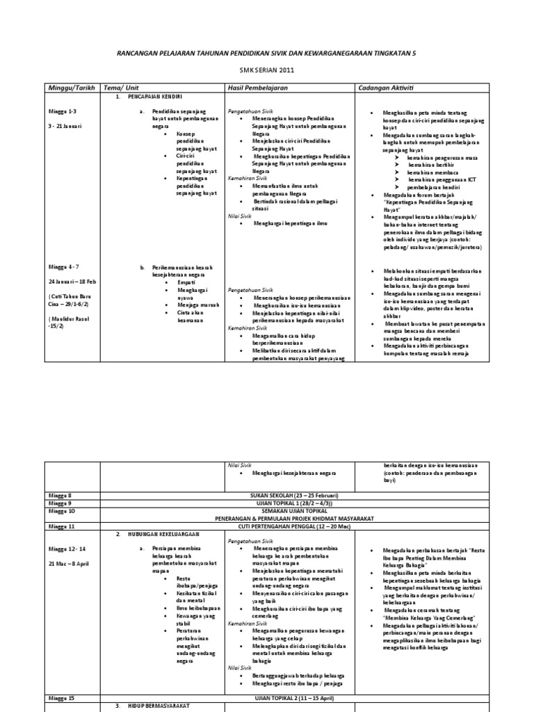 Sumbangan terhadap pembangunan masyarakat melalui penglibatan aktif dalam aktiviti kemasyarakat. Bagi guru sekolah menengah juga antara bahan yang amat diperlukan di awal tahun adalah rancangan pengajaran tahunan ataupun rpt. Rpt pendidikan sivik tingkatan 5 2020 perkongsian ini melibatkan rancangan pengajaran tahunan rpt 2020 bagi tingkatan 5 kbsm bagi mata pelajaran rpt pendidikan sivik tingkatan 5 2020. Pendidikan sivik dan kewarganegaraan tingkatan 5 selasa 26 februari 2013.