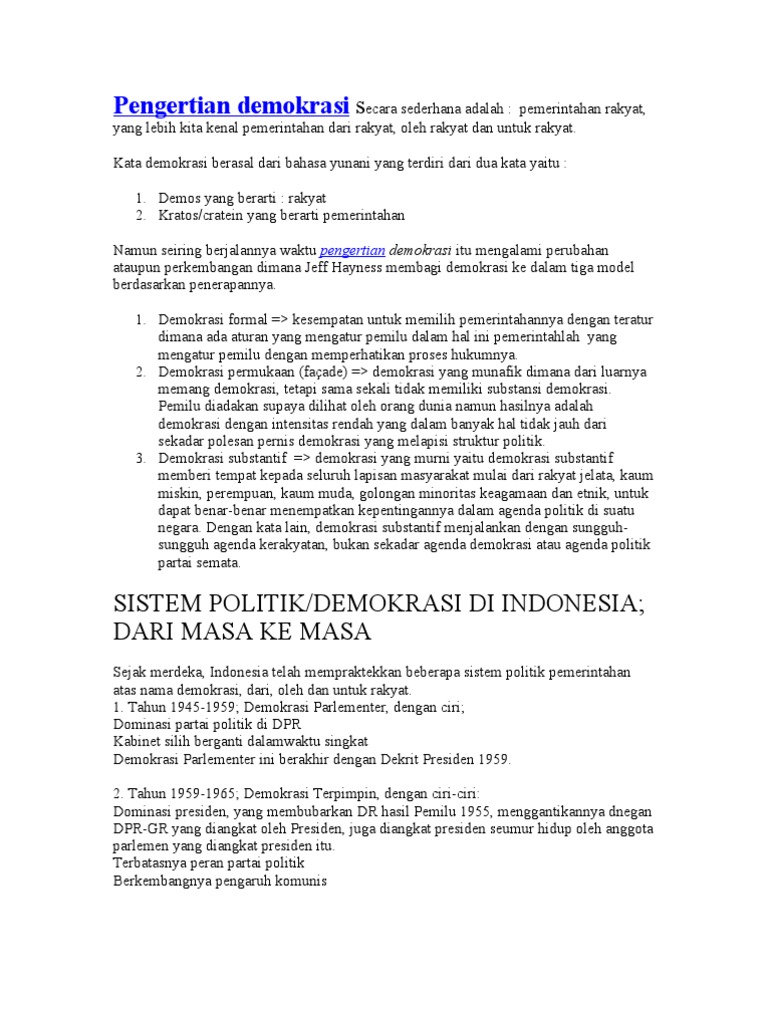 Pengertian demokrasi secara umum. Demokrasi formal yaitu secara umum menetapkan semua orang dalam kedudukan yang sama dalam bidang politik tanpa mengurangi kesenjangan ekonomi. Demokrasi berasal dari bahasa yunani demokratia yang berarti pemerintahan rakyat. Demokrasi juga dapat diartikan sebagai bentuk pemerintahan yang dipegang oleh rakyat atau rakatlah yang mempunya kedaulatan tertinggi. Demokrasi juga dapat diartikan sebagai bentuk pemerintahan yang dipegang oleh rakyat atau rakatlah yang mempunya kedaulatan tertinggi.