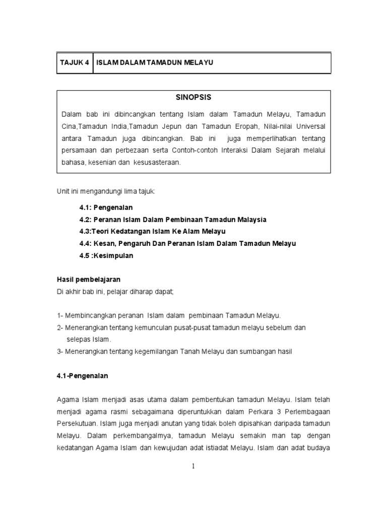 Reseluruhan dasar dasar tersebut merupakan instrumen yang menyumbang kepada pembinaan bangsa malaysia dan tamadun malaysia khususnya dari segi sosiobudaya dan sosiopolitik. Secara literal tamadun india meninggalkan pengaruh yang besar kepada tamadun malaysia melalui penyebaran agama secara khususnya adalah agama buddha dan agama hindu yang banyak dianuti oleh masyarakat di tamadun malaysia oleh yang demikian kita akan lebih menfokuskan kesan dan pengaruh kedua dua agama ini di tamadun malaysia. Penerimaan agama islam sebagai asas tamadun melayu merupakan perkembangan yang paling penting dan membentuk sebuah tamadun melayu islam yang cemerlang gemilang dan terbilang. Dari segi tahun pengajian pelajar tahun satu adalah yang paling ramai mengambil bahagian dalam soal selidik ini diikuti oleh pelajar tahun dua tahun tiga dan tahun empat.