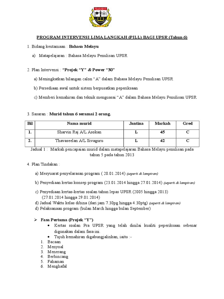 Pelan intervensi bm 1. Program ini dilakukan dalam tiga fasa. Murid sasaran ialah murid tahun 2 dan tahun 3 linus. Membimbing murid murid menjawab soalan tatabahasa dan kefahaman 2.