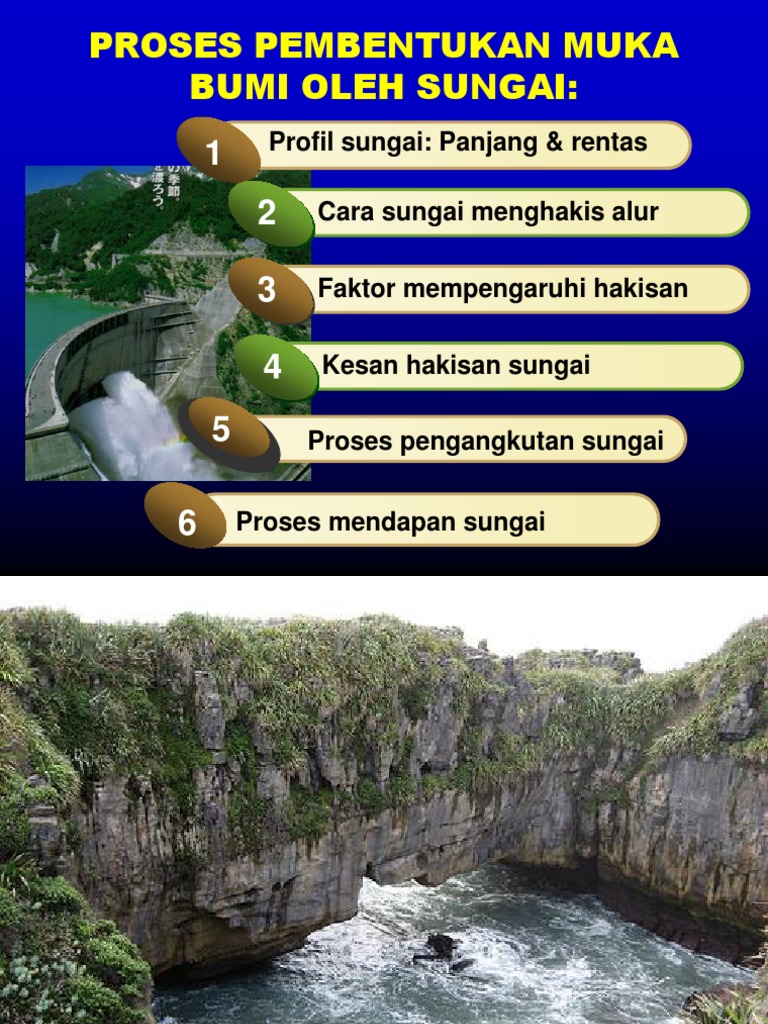 Terangkan proses pembentukan tiga bentuk muka bumi tindakan hakisan sungai. 1 a takrifkan maksud geomorfologi 3 geomorfologi ialah satu bidang sains bumi yang mengkaji interaksi di antara proses faktor dan bentuk di permukaan bumi secara saintifik. Ia biasa terdapat di peringkat hulu dan pertengahan sungai. Volume air di bagian hulu yang kecil mengakibatkan tenaga yang terbentuk pun kecil.