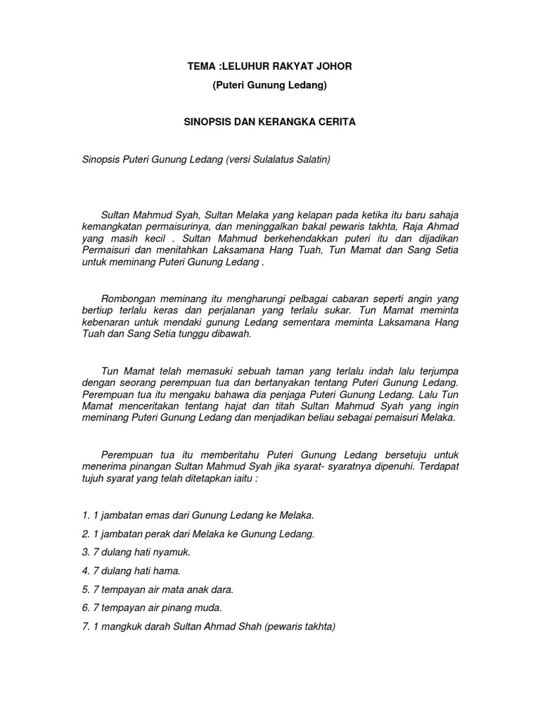 Puteri gunung ledang sinopsis. Puteri gunung ledang adalah sebuah film malaysia yang dirilis pada tahun 2004 film ini mengangkat cerita yang berdasarkan legenda melayu terkenal puteri gunung ledang dibintangi oleh mohamad nasir bin mohamad adlin aman ramlee dan aktris utama tiara jacquelina yang juga menyanyikan lagu asmaradana disutradarai saw teong hin dan diproduksi shazalli ramly. Dalam sejarah melayu puteri gunung ledang dikatakan amat. Buku sejarah melayu adalah lebih lama berbanding hikayat hang tuah. Puteri gunung ledang filem kisah puteri gunung ledang termaktub dalam dua buku lama iaitu hikayat hang tuah dan sulalatus salatin sulalatus salatin lebih dikenali sebagai sejarah melayu.
