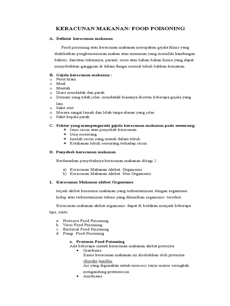 Keracunan makanan ialah penyakit yang biasa berlaku kepada setiap individu tidak mengira usia namun penyakit ini boleh mengganggu aktiviti harian anda dan boleh juga mengancam nyawa. Keracunan yang ditimbulakan akibat makanan yang mengandung neurotoksin yang diproduksi oleh clostridium botulinum disebut botulism. Apa yang menyebabkan keracunan makanan. Keracunan makanan adalah timbulnya penyakit yang terjadi setelah mengkonsumsi makanan yang mengandung racun bahan beracun yang terbentuk akibat pembusukan makanan dan bakter.