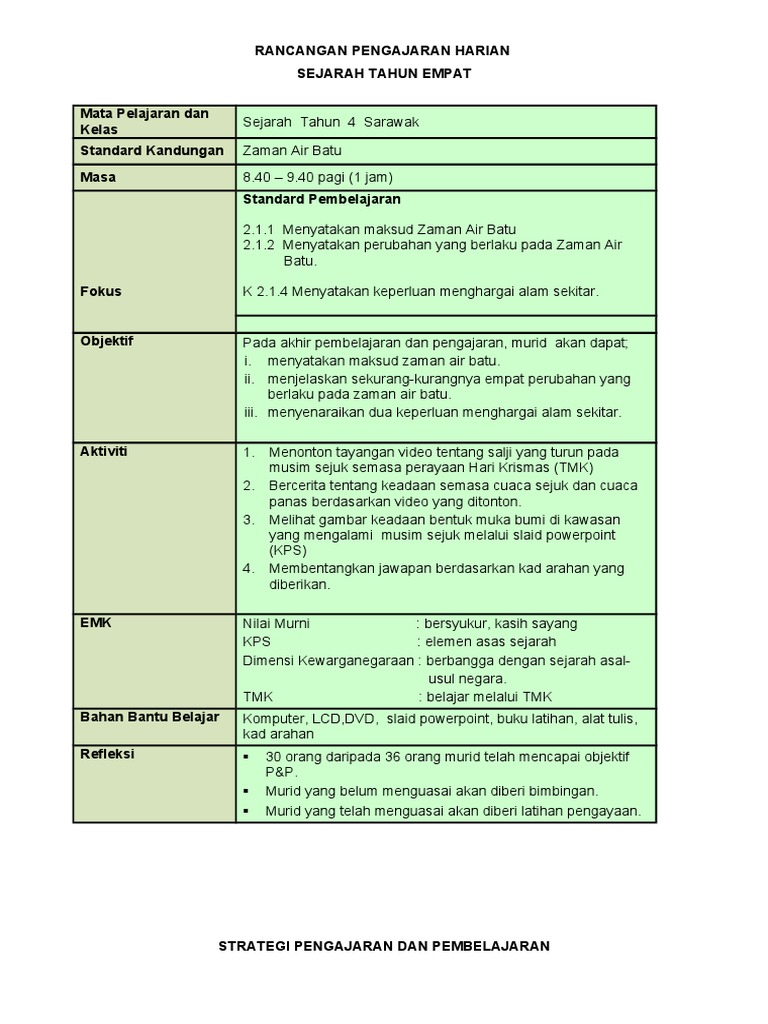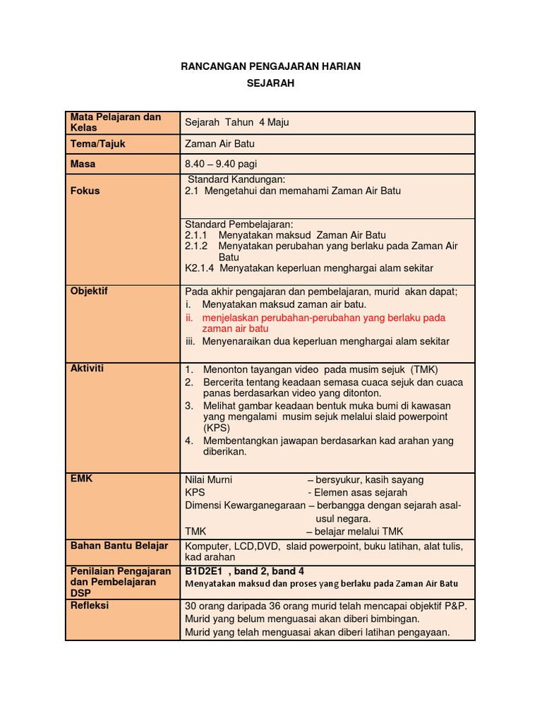 Rancangan pengajaran harian sejarah mata pelajaran dan kelas tema tajuk masa fokus. Berikut merupakan koleksi rph sejarah tahun 4. Apakah yang dimaksudkan dengan zaman air batu. 2 1 1 menyatakan maksud zaman air batu 2 1 2 menyatakan perubahan yang berlaku pada zaman air batu k2 1 4 menyatakan keperluan menghargai alam sekitar.