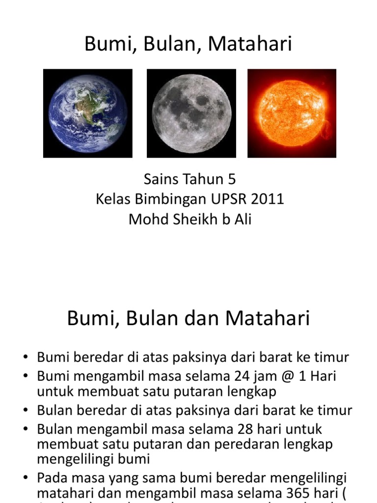 Bahan disediakan oleh cikgu mohd izham bin mahmad redzuan dari sk sinar mutiara pekan pahang yang merupakan salah seorang daripada team task force sains upsr daerah pekan dan berpengalaman selama 10 tahun mengajar upsr. Melalui penggunaan ict para guru boleh memaksimumkan penambahan perkongsian pembelajaran secara online sama ada pembelajaran secara jarak jauh atau pembelajaran kendiri tanpa mengambil kira lokasi dan tahap kemahiran. Bulan tidak mengeluarkan cahaya tetapi memantulkan cahaya matahari untuk sampai ke mata kita. Ejen dan stokis di perlukan 3 years ago indahnya menjadi seorang pendidik.