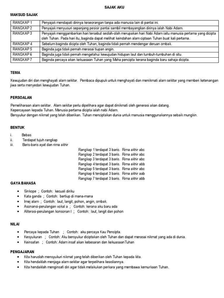Maksud sajak tema persoalan bentuk gaya bahasa nilai pengajaran sajak aku k1. Penyajak menyusuri sepanjang pesisir pantai sambil membayangkan dirinya ialah nabi adam. Cikgu rabiaatul adawiyah morni sms kuching video beserta lirik lagu puisi sajak aku semoga bermanfaat. Tuhan aku percaya kau pencipta kerna aku baru ada.