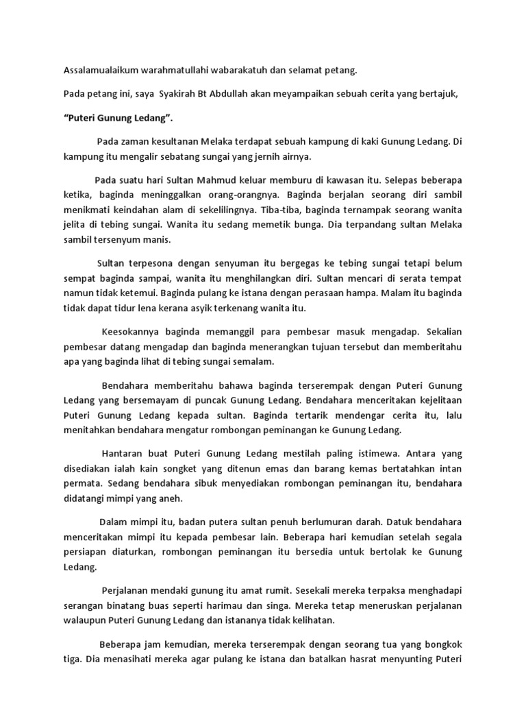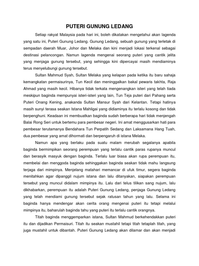 Sinopsis cerita puteri gunung ledang. 1 jambatan emas dari melaka ke gunung ledang. 1 jambatan perak dari melaka ke gunung ledang. Cerita puteri gunung ledang di atas puncak gunung ledang tinggal seorang tuan puteri yang sangat jelita dikenali sebagai puteri gunung ledang. Kisah puteri gunung ledang termaktub dalam dua buku lama iaitu hikayat hang tuah dan sulalatus salatin.
