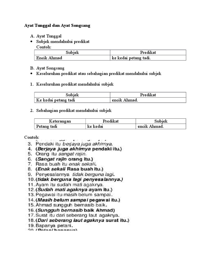 Subjek dan predikat dalam ayat songsang. Dalam susunan songsang konstituen predikat akan dipindahkan ke hadapan subjek ayat. Predikat ayat terdiri daripada frasa nama frasa kerja frasa adjektif dan frasa sendi nama. Ayat tunggul boleh juga wujud dalam susunan songsang melalui proses pendepanan atau penjudulan. Unsur yang dipindahkan ke hadapan itu mesti diberi penegasan iaitu melalui proses pendepanan predikat iaitu.
