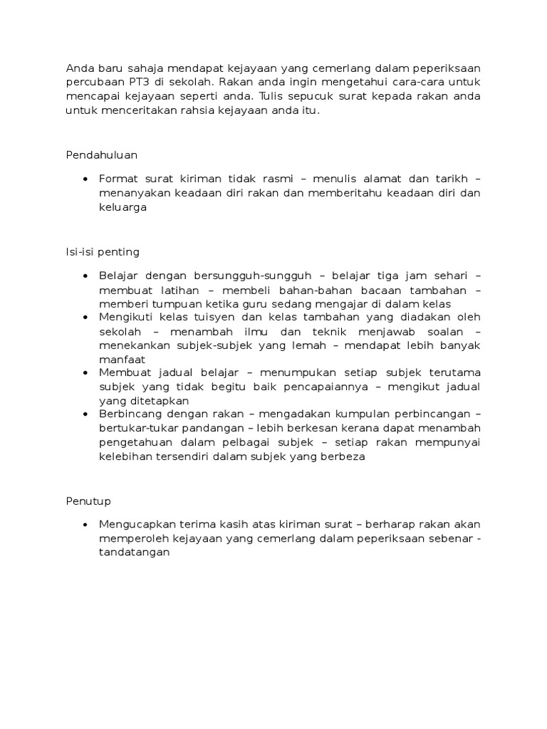 Surat kiriman tidak rasmi mendapat keputusan cemerlang. Biasanya ditulis dengan tujuan untuk memberitahu sesuatu perkara seperti antaranya. Surat tidak rasmi ialah surat yang biasanya ditulis kepada ahli keluarga atau sahabat handai. Surat ucap tahniah 2. Saya juga mohon mendoakan kejayaan saya dalam peperiksaan kali ini.