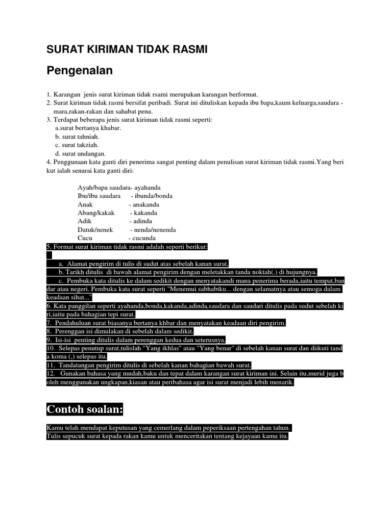 Berikut adalah contoh surat kiriman tidak rasmi dan panduan membuat surat kiriman tidak rasmi yang dapat dikongsikan pada anda semua. Contoh surat kiriman tidak rasmi ringkas dan mudah surat kiriman tidak rasmi adalah bersifat peribadi dan pada kebiasaannya dituliskan kepada ibu bapa. Menceritakan empat tempat menarik di malaysia kepada sahabat 5. Sungguhpun begitu saya tidak begitu risau kerana telah membuat ulangkaji yang secukupnya pada hari hari sebelum peperiksaan berjalan.