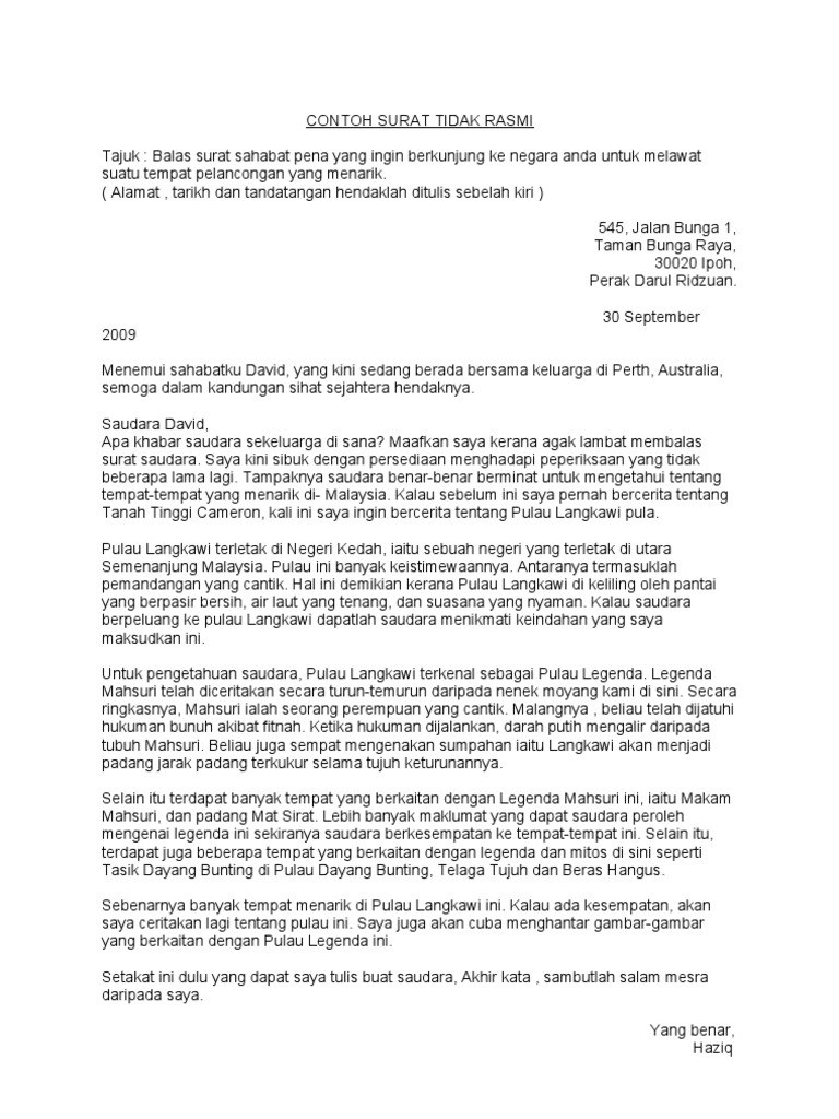 Sahabat pena anda ingin mengetahui tentang tempat tempat menarik yang terdapat di negeri anda. Berikut adalah contoh surat kiriman tidak rasmi dan panduan membuat surat kiriman tidak rasmi yang dapat dikongsikan pada anda semua. Untuk mendapatkan teknik format dan contoh surat tidak rasmi klik. Isi kandungan surat tidak rasmi termasuk bertanya khabar mengucapkan tahniah atau takziah undangan jemputan ucapan dan lain lain.