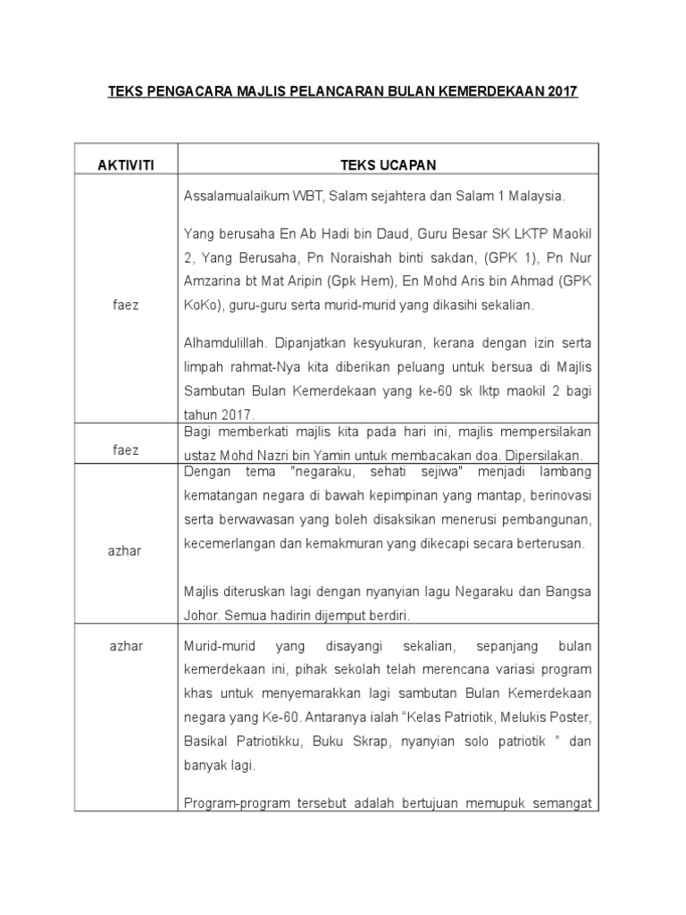 Skrip pengacara majlis majlis perasmian utm international johor horse show 2013. Teks ucapan kppa sempena majlis pelancaran sambutan bulan kemerdekaan 16 ogos 2014 created date. September 02 2017 teks ucapan majlis penutupan bulan patriotisme peringkat sekolah sambut merdeka sekali setahun keringat tercurah pejuang berjasa malaysiaku merdeka 58 tahun. 1 teks pengacara majlis sambutan bulan kemerdekaan sk kota 2017 para murid yang dikasihi majlis akan bermula sebentar lagi untuk itu diminta semua untuk senyap dan tumpukan perhatian kepada majlis yang akan berlangsung.