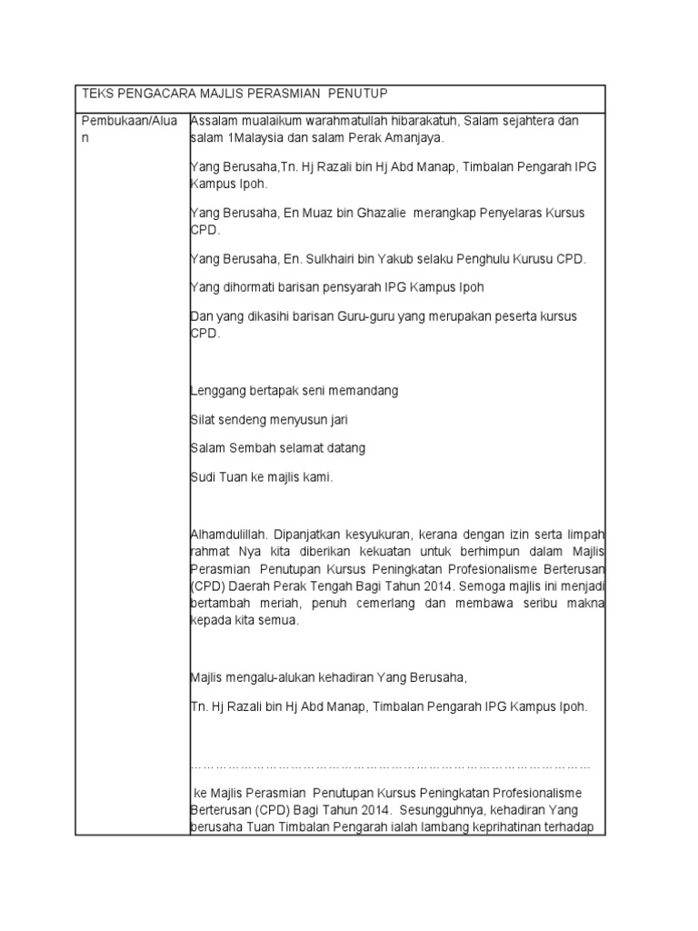 Teks pengacara majlis perasmian penutup. Diharapkan dengan ucapan sebentar tadi dapat memberi semangat dan dorongan kepada kita untuk bersama sama membantu pihak berkuasa bagi membenteras jenayah di kawasan masing masing. Teks pengacara majlis perasmian penutupan program 1. Skrip pengacara majlis penutup pbl. Skrip pengacara majlis kursus yang simple kata aluan.