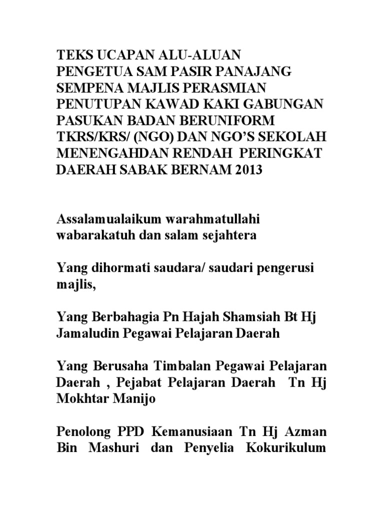 Teks ucapan alu aluan pengetua. Kehadiran tetamu dan jemputan pengumuman. Jeneral profesor datuk seri panglima dr. Malam jalinan kasih 14 dis 2012 terima kasih saudara pengerusi majlis yang dihormati timbalan presiden. Ismail haji bakar ketua setiausaha negara sempena majlis pelancaran pelan anti rasuah nasional pada 29 januari 2019 jam 9 00 pagi di pusat konvensyen antarabangsa putrajaya salutations 1.