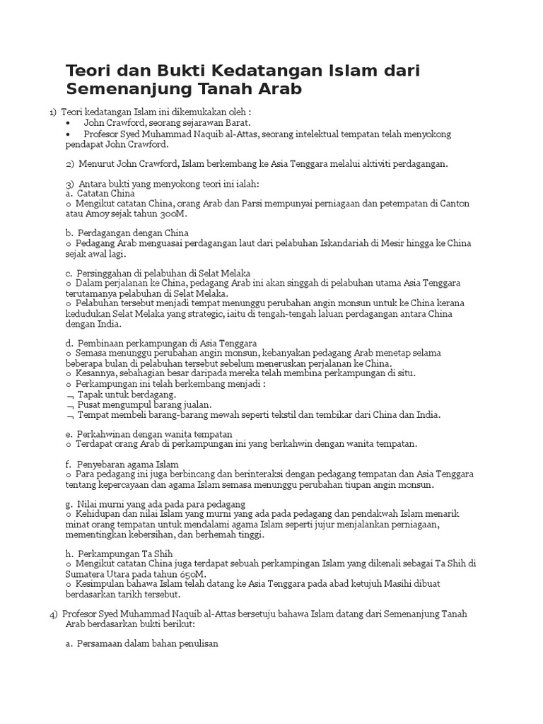 Teori kedatangan islam dari arab. Teori kedatangan islam dari tanah arab parsi hubungan perdagangan negara arab dengan tanah melayu telah berlaku sebelum wujudnya islam lagi. Dugaan kami pada teori makkah atau arab adalah islam dibawa para musafir arab yang memiliki semangat dan sengaja untuk menyebarkan islam ke seluruh belahan dunia termasuk di indonesia. Proses ini berlangsung pada abad pertama hijriah atau lebih tepatnya pada abad ke 7 m. Teori kedatangan islam ke tanah melayu.