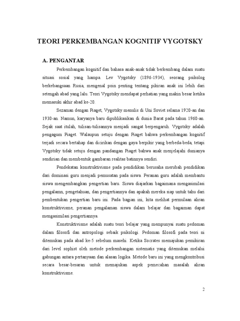 Teori perkembangan kognitif piaget dan vygotsky makalah untuk memenuhi tugas matakuliah landasan psikologi pendidikan yang dibina oleh irene maya simon s pd m pd oleh. Ia dikenal sebagai ahli konstruktivis pertama yang beranggapan bahwa belajar merupakan proses pembelajaran yang ditemukan oleh diri sendiri maksudnya proses belajar seseorang terjadi karena interaksi dan pengamatan yang dilakukan pada lingkungannya. Pada tahun 1916 piaget menyelesaikan pendidikan sarjana bidang biologi di universitas neuchatel. Artikel ini berusaha untuk memberikan sebuah pemahaman tentang dua teori jean piaget dan lev vygotsky yang menyoroti persamaan dan perbedaan antara pendekatan piaget dan vygotsky.