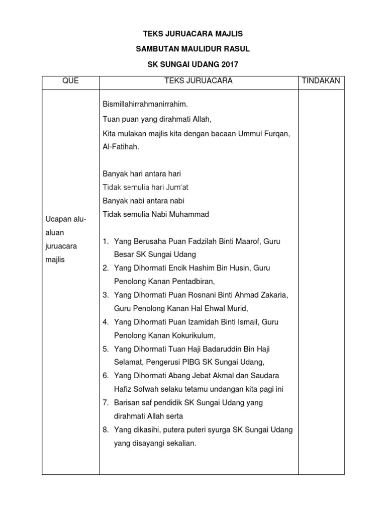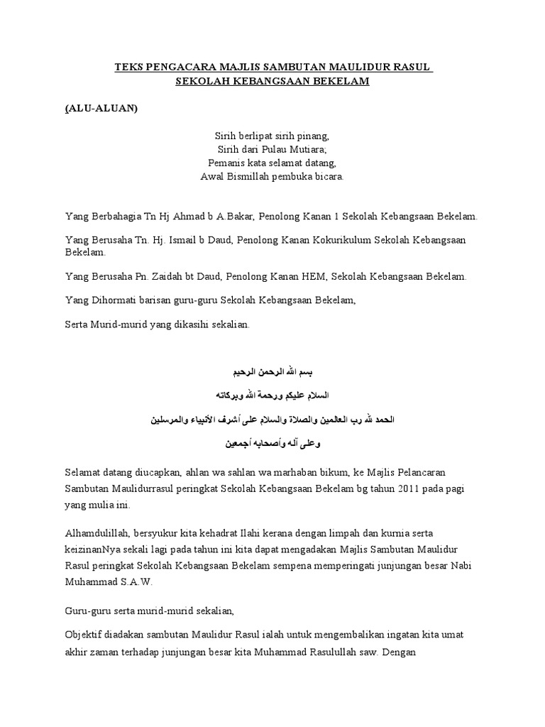 Ucapan alu aluan majlis maulidur rasul. Bacaan doa ucapan alu aluan dan ucapan perasmian pemotongan kek oleh yb naroden sebagai simbolik perasmian. Nyatakan tujuan dan matlamat majlis hari ini. 22 februari 2 0 13. Teks pengacara majlis maulidur rasul 1.