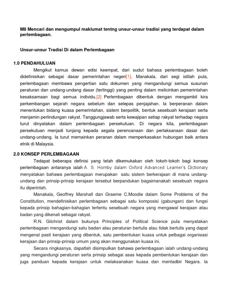 Unsur tradisi dalam perlembagaan yang tidak boleh dipertikaikan. Semua unsur tradisi yang terdapat di dalam perlembagaan malaysia sebenarnya telah dipersetujui bersama oleh komponen parti perikatan semasa merangka perlembagaan persekutuan tanah melayu 1957. Kaum cina dan india tidak di sebut langsung dalam perlembagaan persekutuan. Justeru pengubalan perlembagaan persekutuan yang digubal suruhanjaya perlembagaan reid pada tahun 1956 sangat unik bagi sebuah negara berdaulat seperti malaysia. 2 0 kesimpulan kesimpulannya kontrak sosial yang dipersetujui oleh pemerintah golongan elit dan pembangkang semasa awal penggubalan perlembagaan merdeka 1956 lalu telah menjadi unsur tradisi yang terus dikekalkan dan.